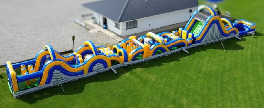 New for 2025! The 108' Obstacle Course is perfect for all ages including adults and teens. It features multiple obstacles, rock climbing wall and splash pool at the end of the slide if using with water.