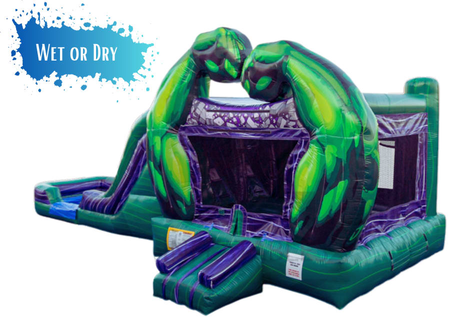 Get ready for an action-packed party with the incredible Hulk Bounce House/Slide Combo! This amazing inflatable features a large bounce area, dual slides for racing, and basketball hoop. This unit definitely comes with the "WOW" factor. It is perfect for any superhero party.