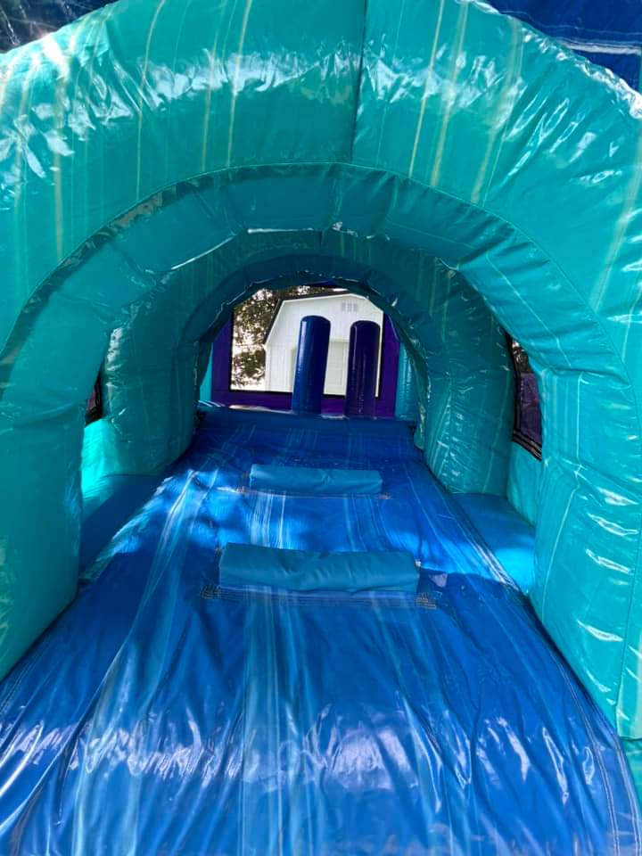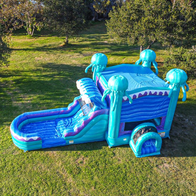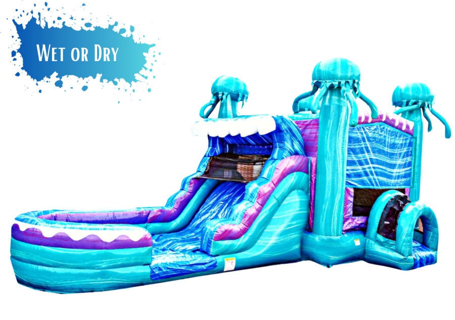 The Electric Jellyfish Combo Slide/Bounce House can be used wet or dry and is the ultimate inflatable play structure that will bring endless fun to your events and parties. This wrap-around style combo unit features a crawl-through entrance, dual slide, bounce house, obstacles, and a basketball hoop, providing hours of entertainment for all ages, kids, adults and teens!