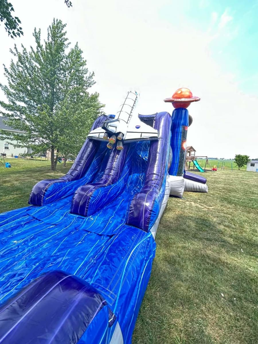 Galaxies Away Bounce House has a Dual Slide and Basketball Hoop. It can be used wet or dry. Get ready to take your next event to infinity and beyond with this out-of-this-world inflatable experience! Book now for an adventure your guests won't forget! Contact us today for availability and pricing. Let's make your event a cosmic celebration!